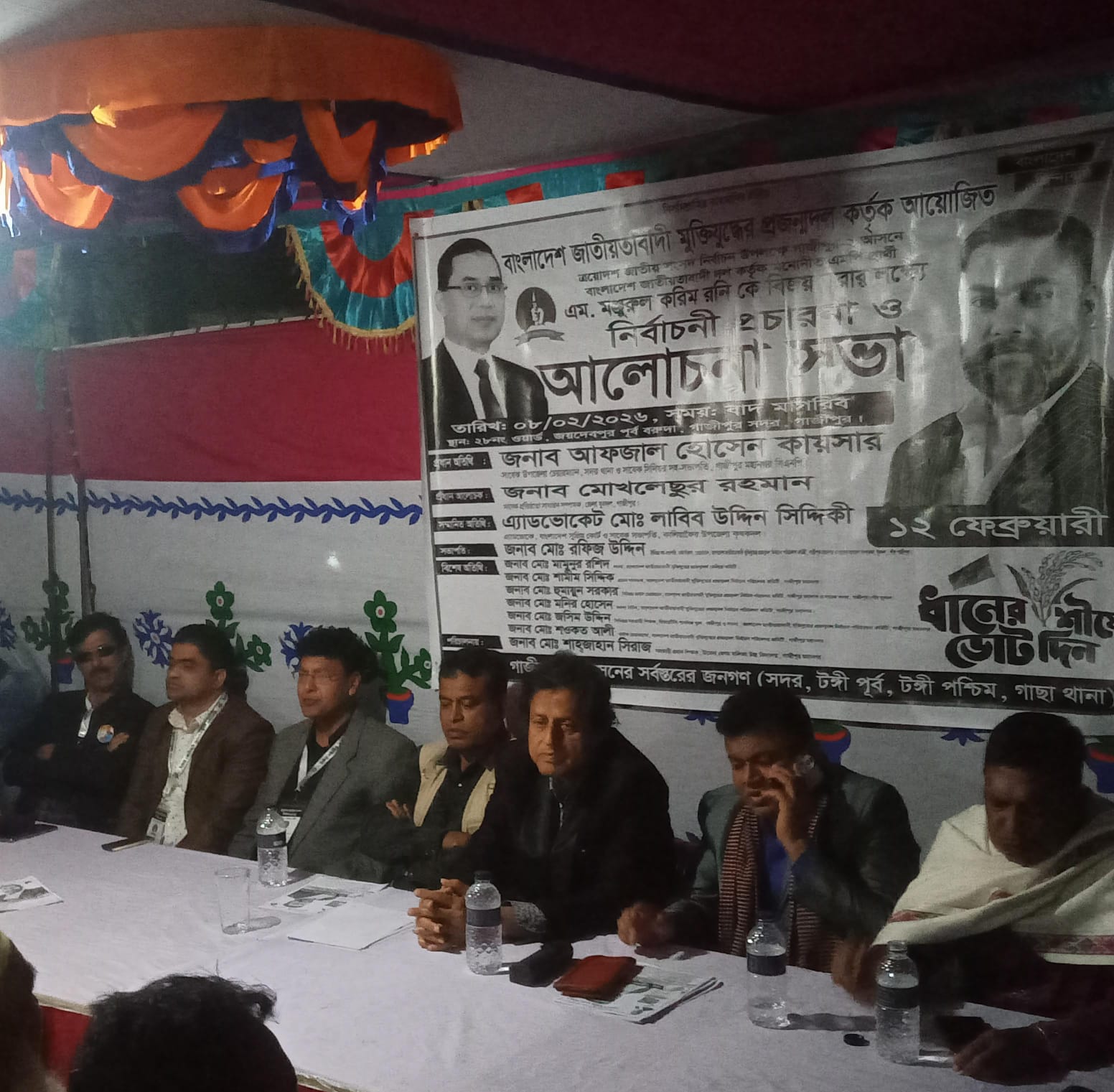 নিজস্ব প্রতিবেদক : বাংলাদেশ জাতীয়তাবাদী মুক্তিযুদ্ধের প্রজন্ম দল কর্তৃক আয়োজিত এয়োদশ জাতীয় সংসদ নির্বাচন উপলক্ষে গাজীপুর-২ আসনের বাংলাদেশ জাতীয়তাবাদী দল (বিএনপি) মনোনীত এমপি প্রার্থী এম. মনজুরুল করিম রনি কে বিজয়ী করার লক্ষ্যে নির্বাচনী প্রচারণা ও আলোচনা সভা অনুষ্ঠিত হয়।