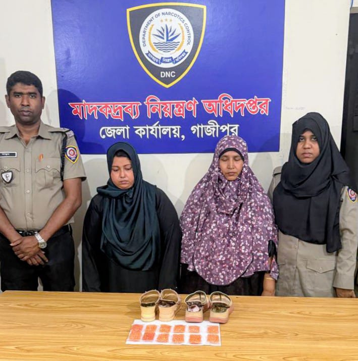 গাজীপুরের কালীগঞ্জে বিশেষ অভিযানে জুতার ভেতরে কৌশলে লুকানো ২ হাজার ৪০০ পিস ইয়াবাসহ দুই নারীকে গ্রেপ্তার করেছে মাদকদ্রব্য নিয়ন্ত্রণ অধিদপ্তর গাজীপুর জেলা কার্যালয়।